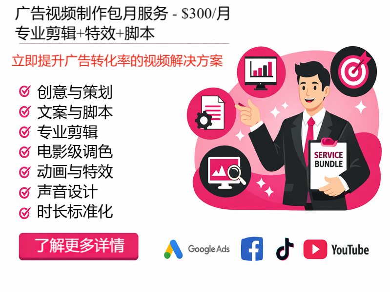 - ✅ 视频不适合广告平台?我们专门制作符合Google Ads、Facebook Ads、TikTok Ads要求的规格视频