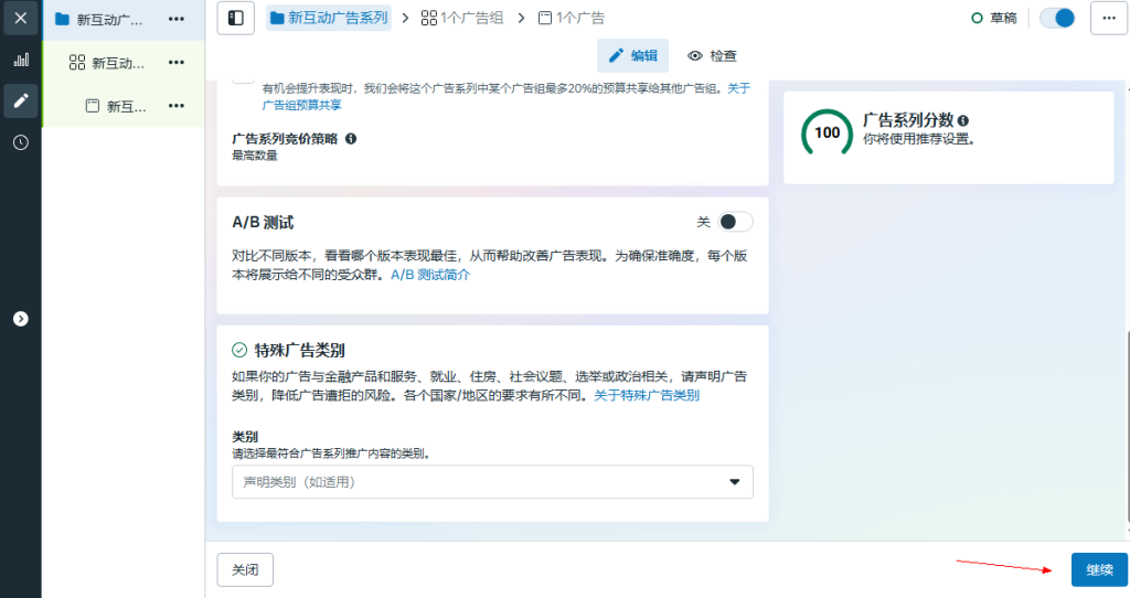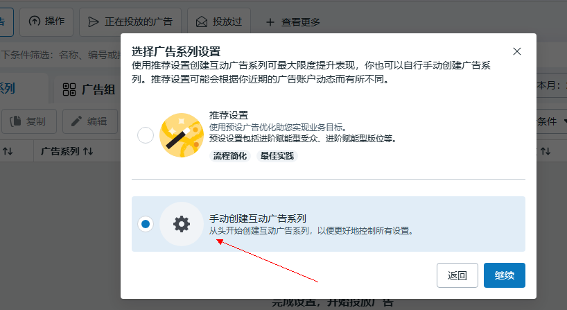 5:考虑到新手预算问题,建议不要默认自动,选择【手动创建互动广告系列】