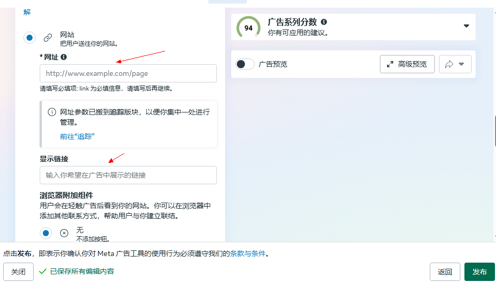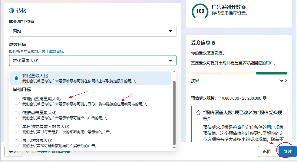8:网站成效目标 新手选择【落地页流量最大化】应为你还没有对接像素不要选择 转化量最大化