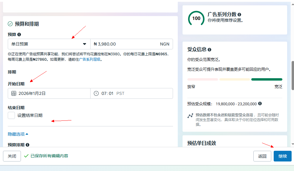 9:这里根据自己情况选择【每日预算】【开始时间】【设置结束时间】