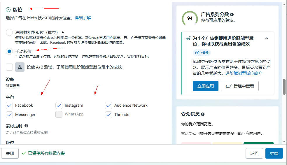 12:版位这里考虑到新手,以免浪费广告费,选择手动版位,可以关闭一些没必要的版位,留下Facebook即可。