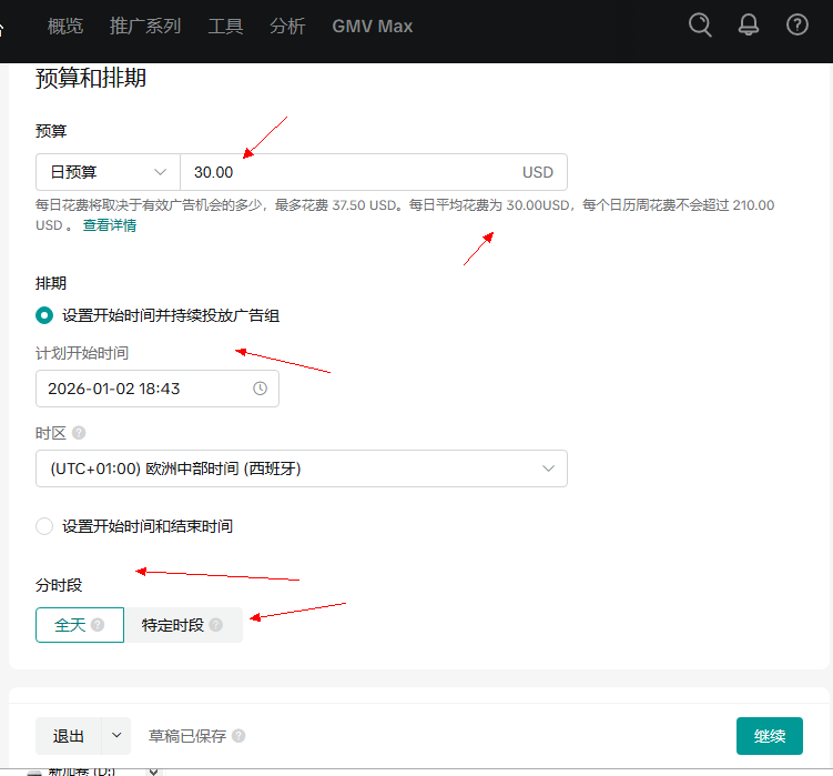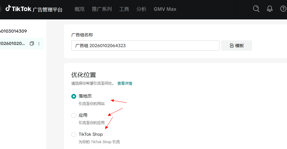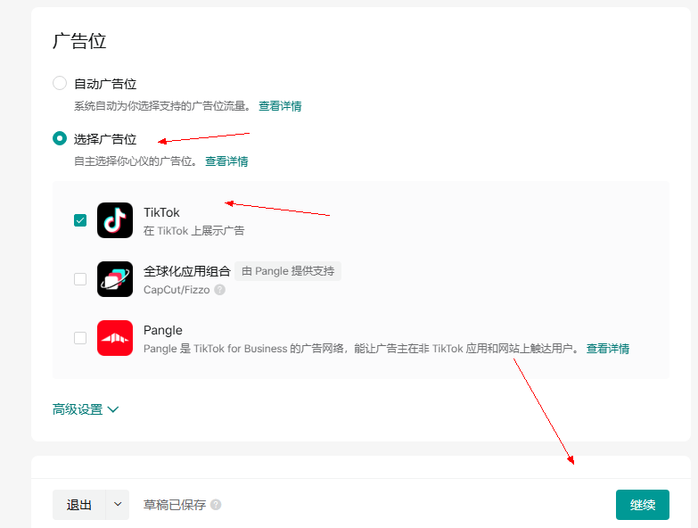 4:广告位选择,新手建议就开在TikTok上展示广告就可以了,继续下一步。