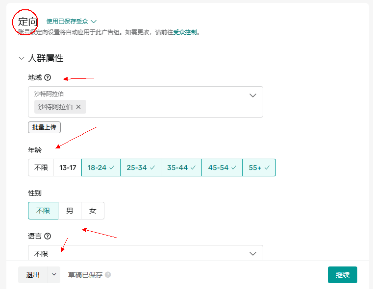 5:根据自己物流畅通情况,选择广告要投放的地区,年龄,性别,语言,继续下一步。