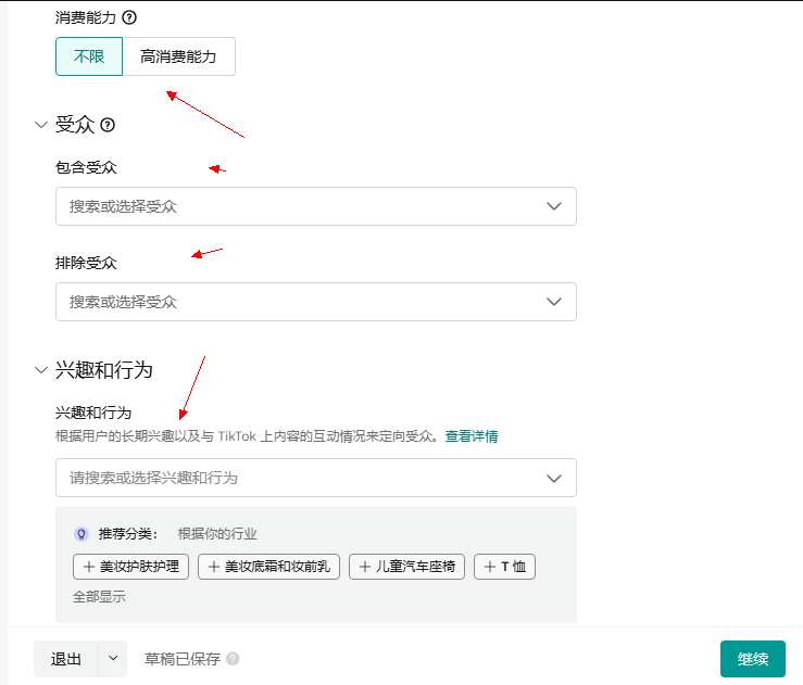 6:消费能力:如果你是高档商品的建议勾选高消费能力,普通商品默认即可。包含受众与排除受众,暂时不做处理,兴趣和行为 根据你商品行业:搜索关键词勾选兴趣与行为人群。