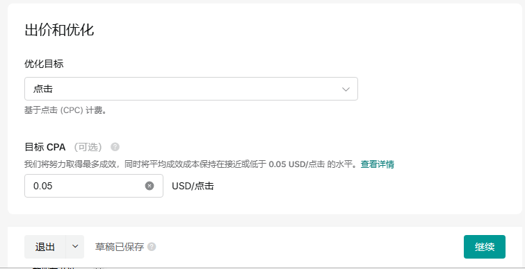 9:出价和优化:暂时已兴趣人群【点击】目标CPA 出价0.05即可,先看一下数据与你所在的行业竞争情况,后面再做微调。